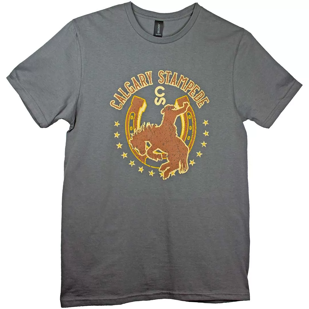 Custom made for the Calgary Stampede, this t-shirt features short sleeves, crew neck and a bronco horseshoe Calgary Stampede graphic.