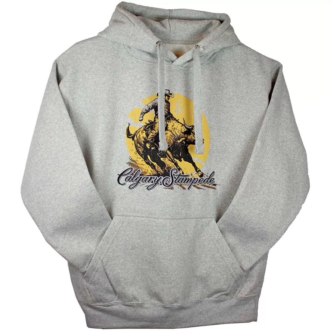 Custom made for the Calgary Stampede, this hoodie features a bull rider Calgary Stampede logo graphic, kangaroo pocket and drawstring hood.