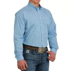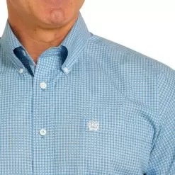 From the stylish all-over geometric print to the timeless, must-have details, this light blue cotton plain weave checks all the necessary boxes. Design features include an open left front pocket, embroidered CINCH logo and cream buttons.