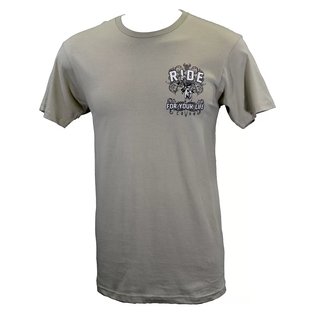 From Cowboy Hardware this tan short sleeve T-Shirt will look great either under your favorite snap or button western shirt or as is. The “Ride For Your Life” design is a front and back screen printed design. with a condensed version of the back design on the front left chest.