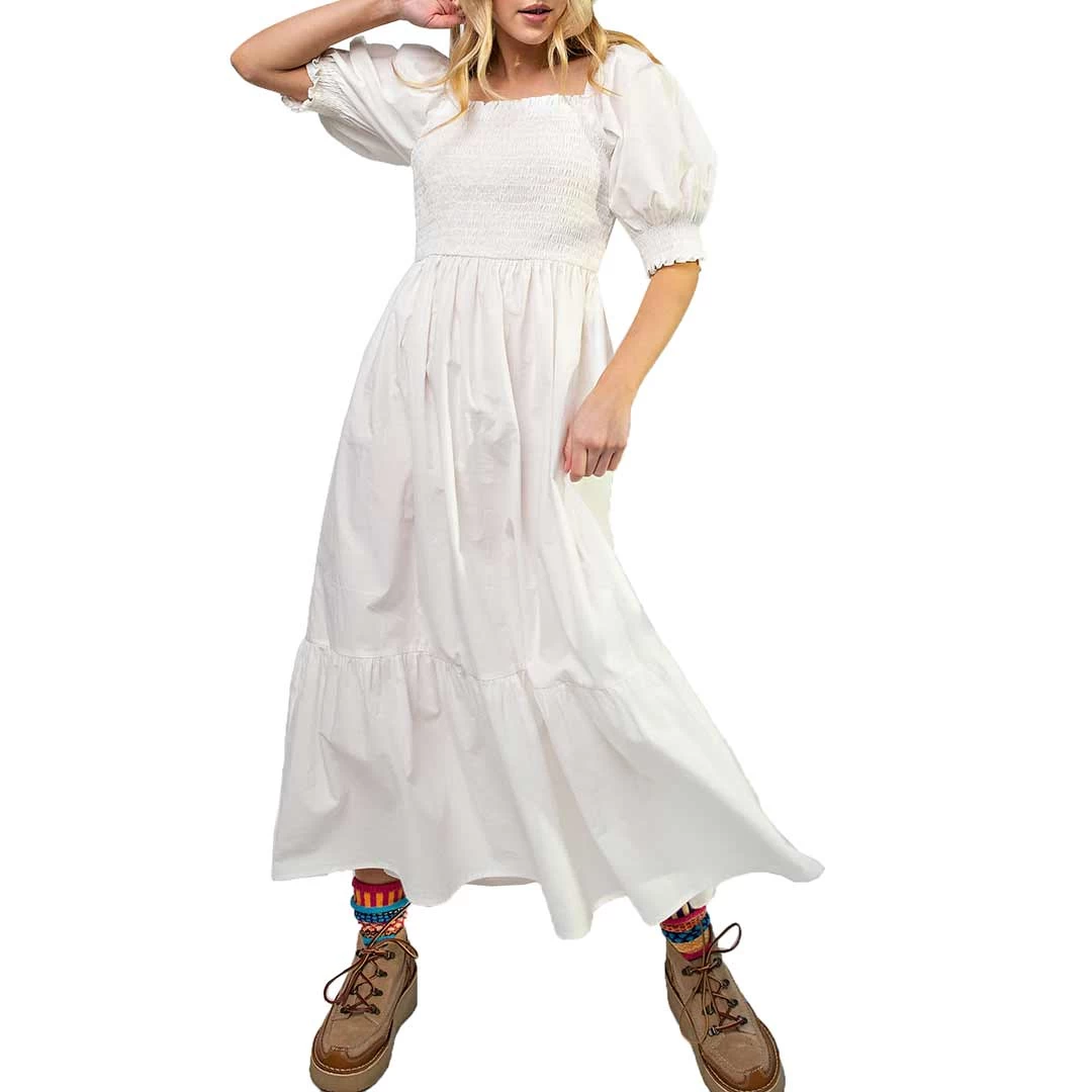 This fun and flirty summer dress from Easel features 3/4 length puff sleeves with elastic cuffs, a smocked bodice, square neck and a two-tiered ruffle skirt.