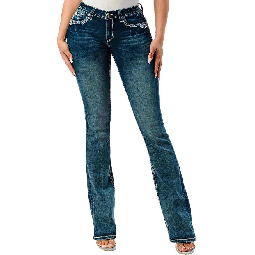 The Grace in LA women’s bootcut jean in Easy Fit shows off your best shape by featuring a higher rise. The denim fabric features a softer and higher stretch for exceptional comfort all while maintaining a denim look. The mid-rise creates a form-flattering fit for every curve. The jean is detailed with an Aztec embellished and embroidered design on the back pockets, added embellishment on the front pockets, natural hand-sanding, and whiskering. They look like they’ve been yours forever.