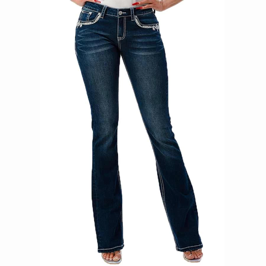 The Grace in LA women’s bootcut jean in Easy Fit shows off your best shape by featuring a higher rise. The denim fabric features a softer and higher stretch for exceptional comfort all while maintaining a denim look. The mid-rise creates a form-flattering fit for every curve. The jean is detailed with an Aztec embellished and embroidered design on the back pockets, added embellishment on the front pockets, natural hand-sanding, and whiskering. They look like they’ve been yours forever.
