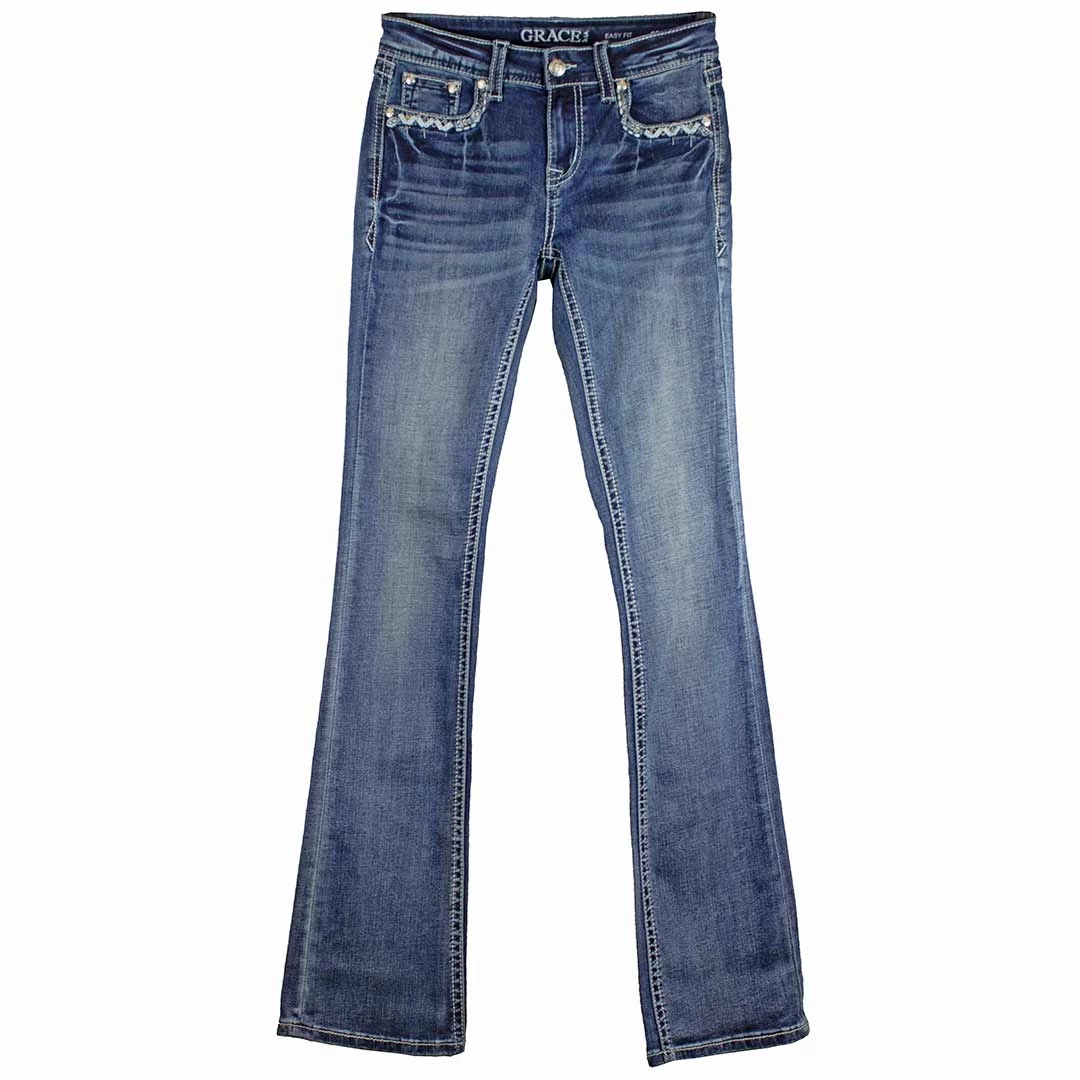 The Grace in LA women’s bootcut jean in Easy Fit shows off your best shape by featuring a higher rise. The jean is detailed with a diamond embellished design on the faux flap back pockets, added embellishment on the front pockets, distressing, and natural hand-sanding. The denim fabric has the perfect amount of stretch and great holding power.