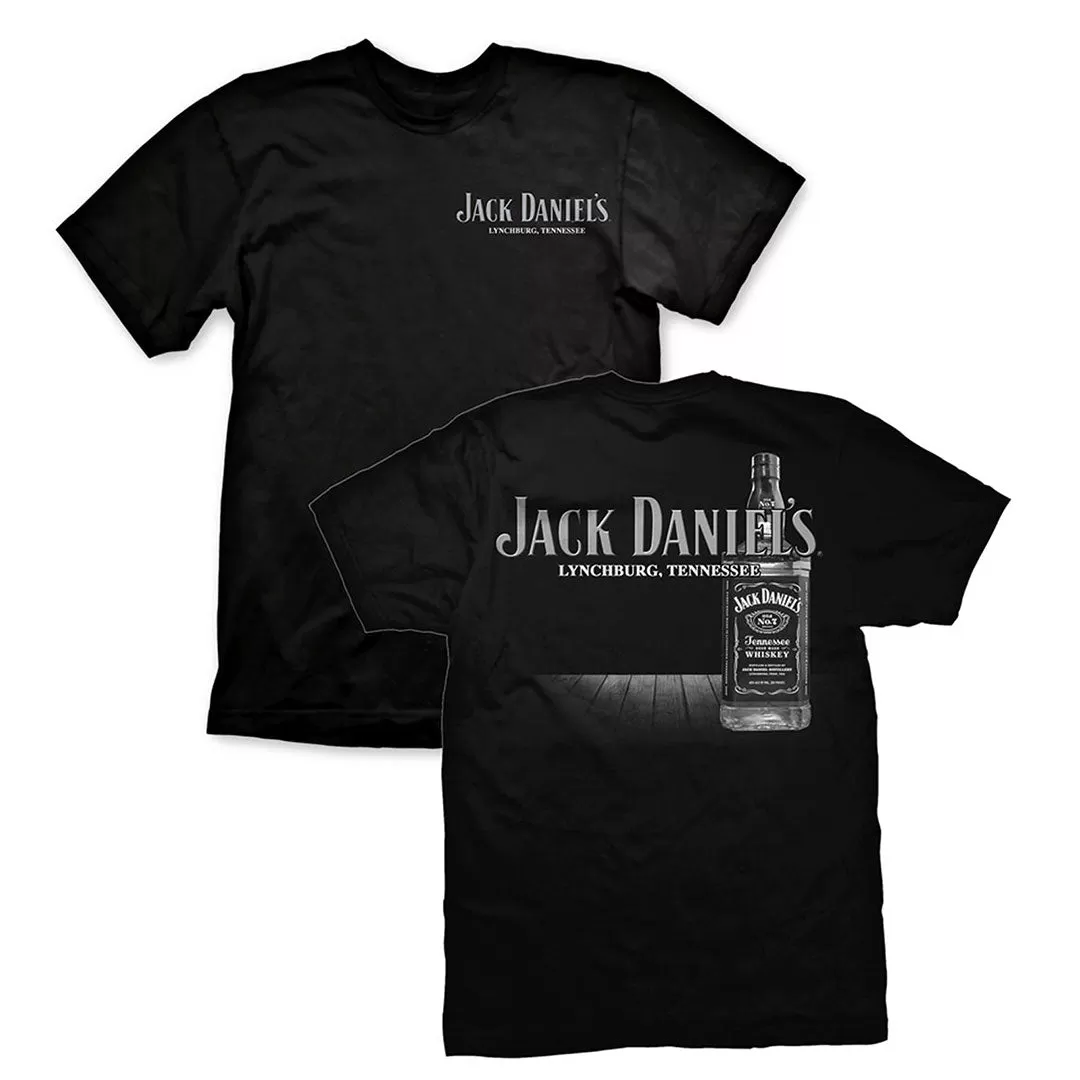 Officially Licensed Jack Daniel’s black short sleeve t-shirt with Jack Daniel’s Lynchburg Tennessee logo on front left chest and tonal bottle design on back.