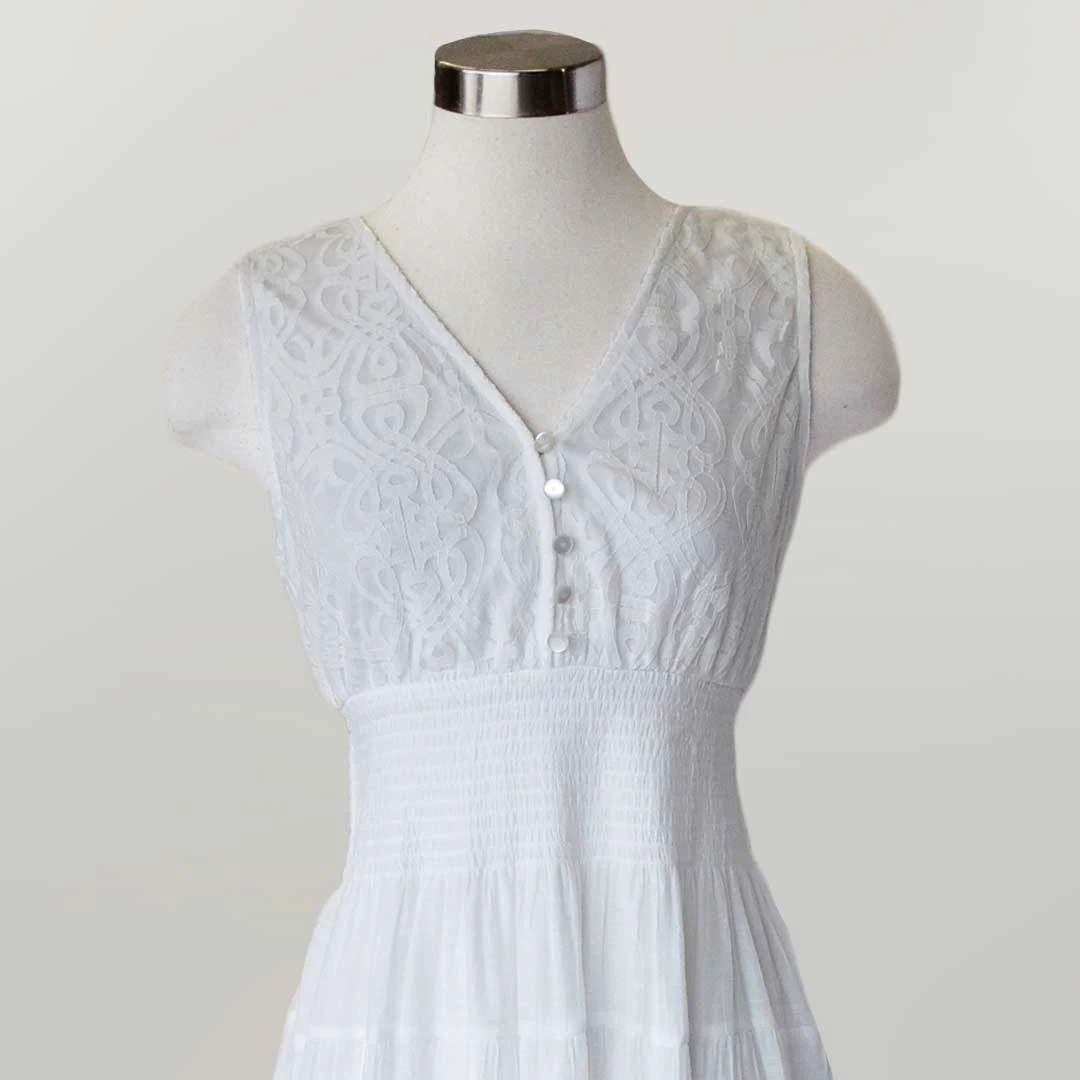 Summer here we come! From Keren Hart, this women’s dress is just what you need to welcome the warm weather. The dress is constructed with three parts, a lace overlay bust with a V-neck and button accents, a wide elastic waist band and a tiered skirt. Pair with cute sandals or your favorite cowboy boots, this dress is a must have this season.
