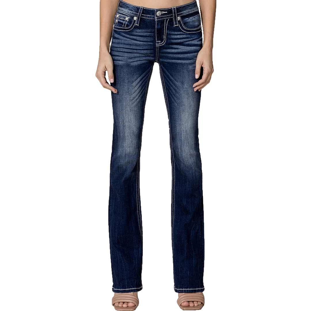 Mid rise dark wash bootcut detailed with hand sanding, embroidered steer head and a 5 pocket with rhinestone rivets from Miss Me.