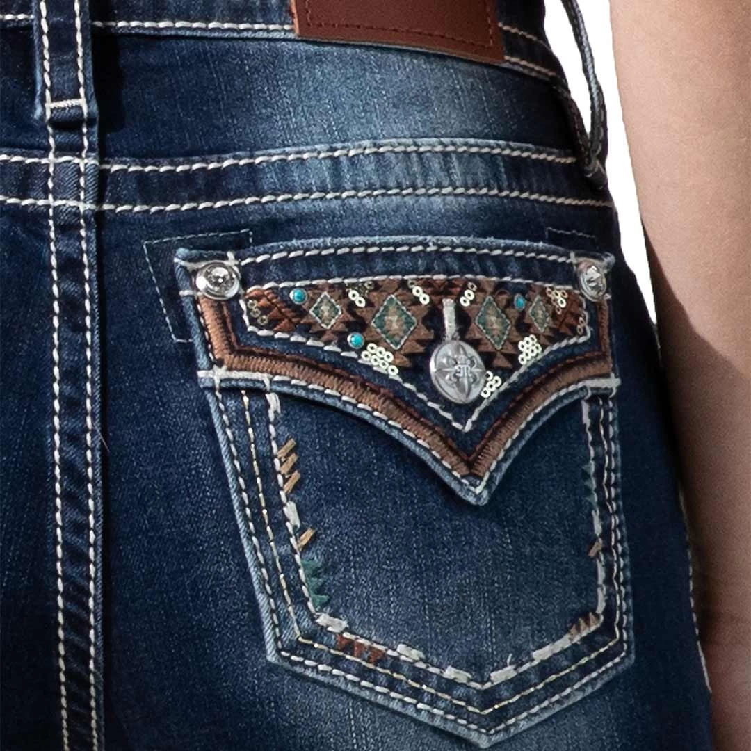 Dark blue bootcut jean with whiskering, embroidered Aztec design, turquoise and sequin trim and a faux flap pocket with rhinestone rivets from Miss Me.