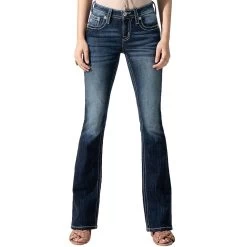 Dark blue mid rise bootcut jean with contrast stitching, embroidered Aztec wings with leather details, studded trims and a 5 pocket with rhinestone rivets from Miss Me