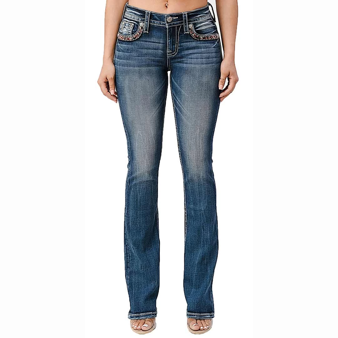 Stand out in this pair of bootcut jeans from Miss Me. Features include floral embroidered faux flap back pocket, border stitching, whiskering, fading, contrast stitching, and a 5-pocket design.