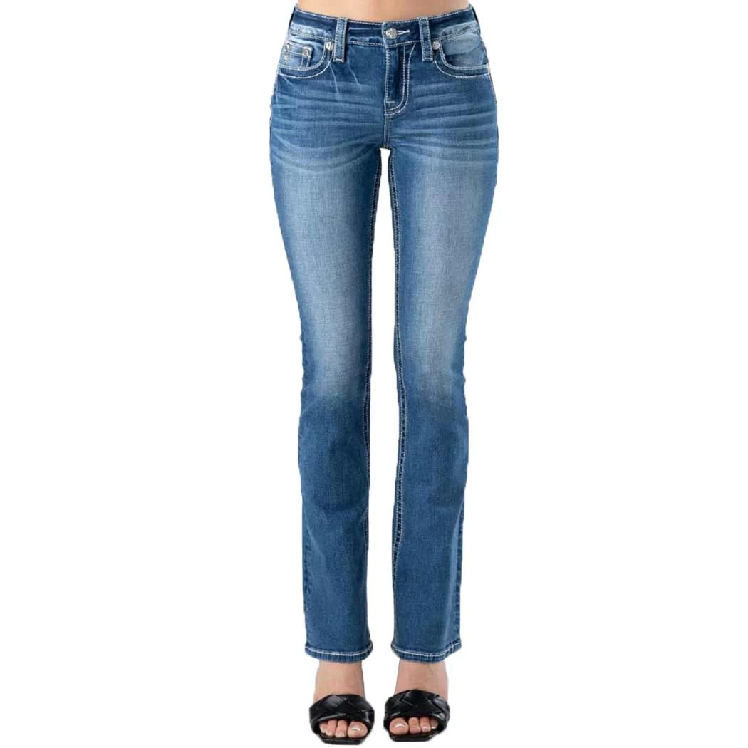 The Floral Horseshoe design from Miss Me is a mid-rise, light medium wash bootcut jean. Back pockets feature embroidered floral horseshoe with leather outline, sequins, and stud detailing. Flower brand patch features multicoloured embroidery and stitch work.