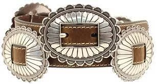 Beautiful silver burnished oval conchos interwoven on a chocolate brown leather belt.