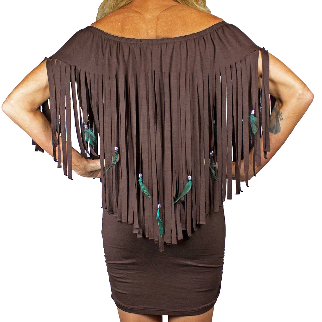 This Black Mini Peasant Dress from Pat Dahnke has become one of our hot new dresses. The fringe covers a lot of sins yet is so flattering. It is done in brown with turquoise feathers. It has the movement and drama one wants. One could wear this dress ruched at the hips over leggings. You will be the envy of all on the dance floor.