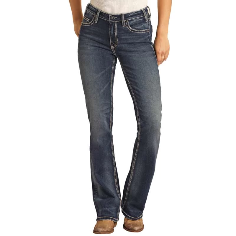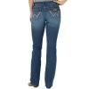 Combine your western style with a modern edge when you wear these Rock & Roll Denim jeans. These midrise boot cut dark vintage wash jeans features a cow print embroidered design on the back pockets and copper topstitching. A brown leather waistband label round out the features of this stylish jean for the everyday cowgirl.