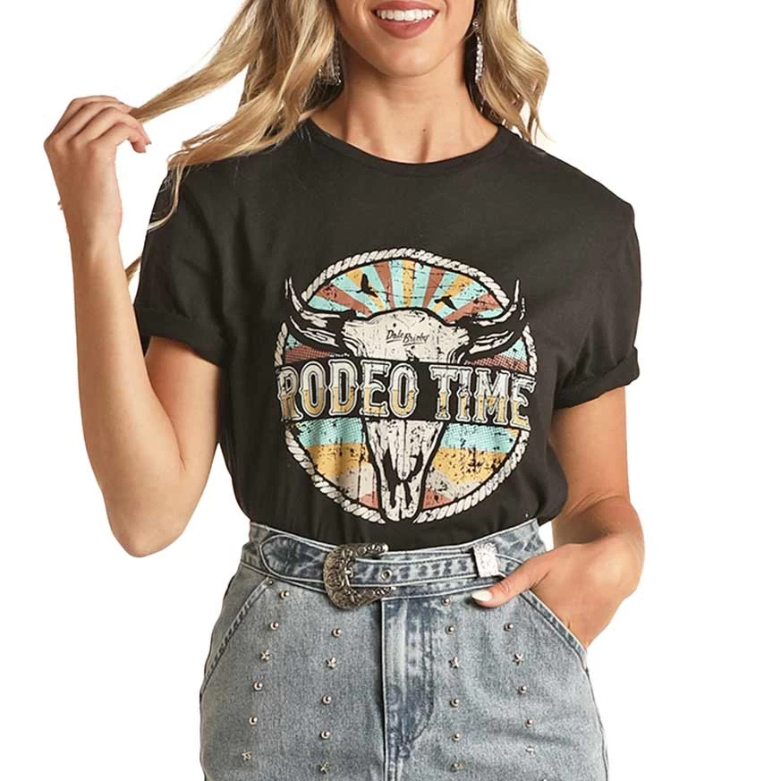 You can’t go wrong with a Dale Brisby tee from Rock & Roll Cowgirl. This women’s oversized T-shirt features a rodeo time graphic, crew neck and short sleeves.