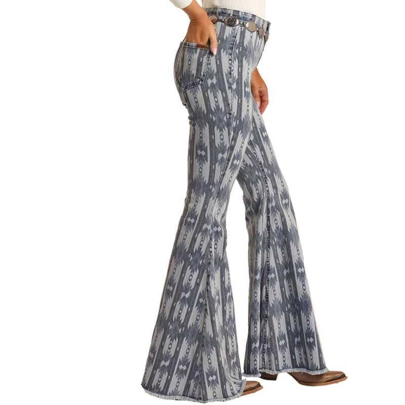 Rock & Roll Denim Women’s High Rise Extra Stretch Aztec Print Bell Bottom Jeans
