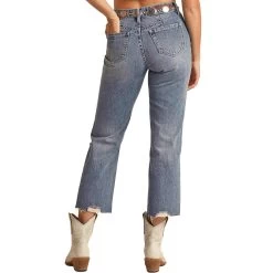 From Rock & Roll Denim, this is a woman’s straight leg jean in a medium vintage wash. It features floral embroidered patches under the supper distressed legs and a cropped length.