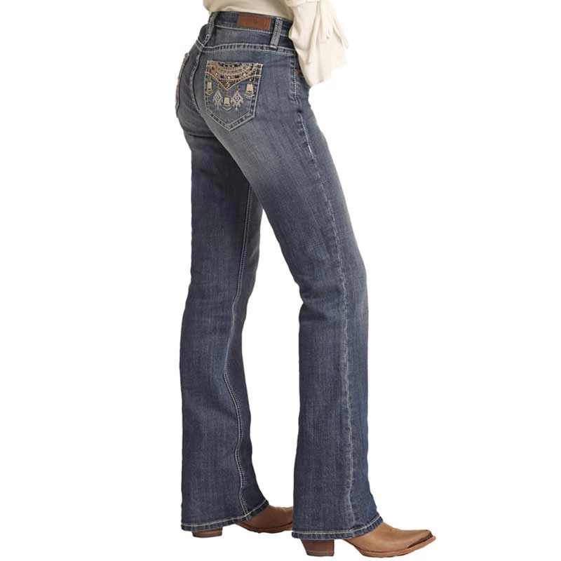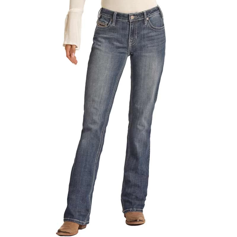 From Rock & Roll Denim, these extra stretch mid rise bootcut jeans in a medium vintage wash feature a metallic embroidery detail on both back pockets. Contrast top-stitching and brushed silver trims, leather waistband label and zip fly.