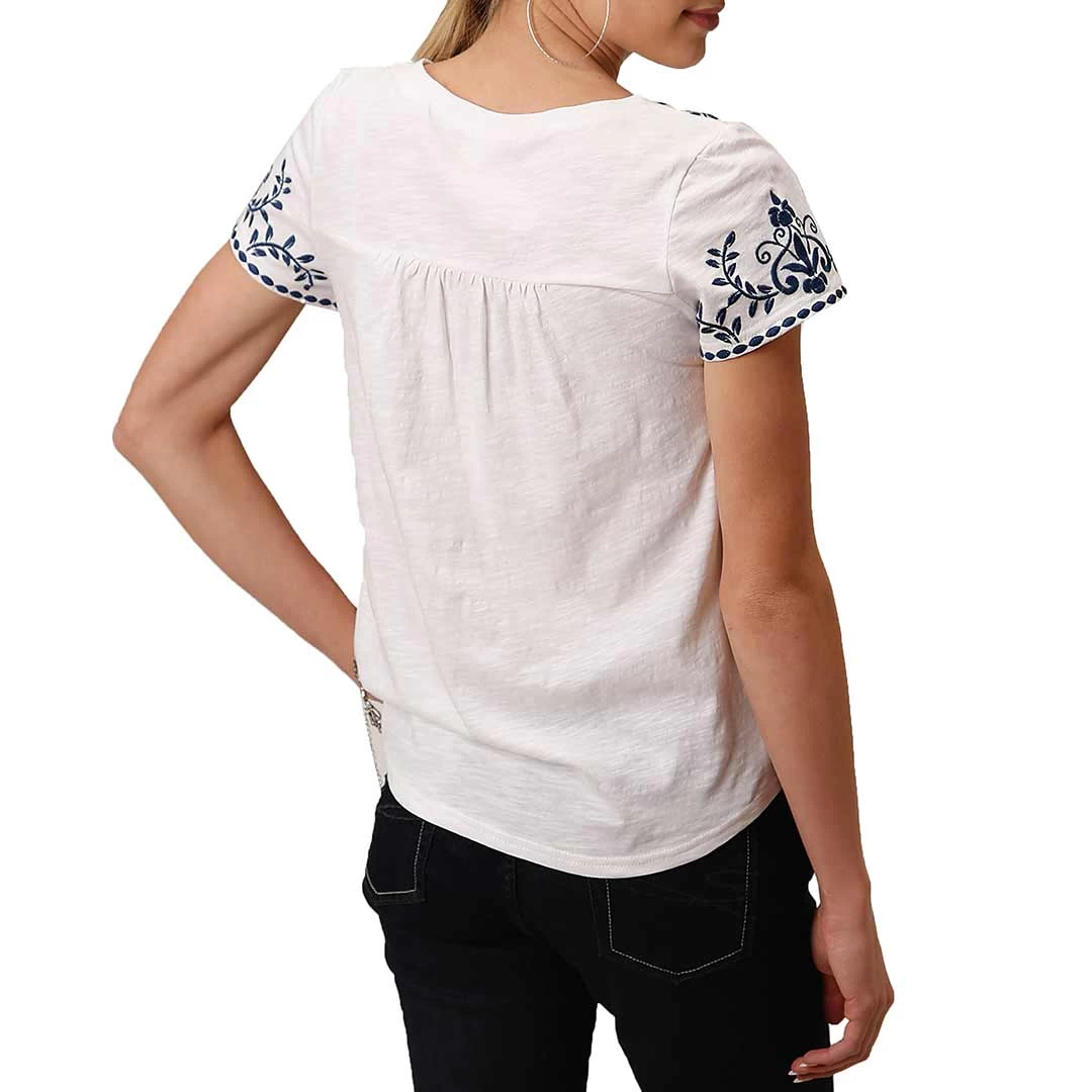 Worn alone or under a jacket or vest, brighten up your favourite denim with this short sleeve top from Roper. This t-shirt features floral embroidery details on the sleeves and along the neckline, a round neck and gather yokes.