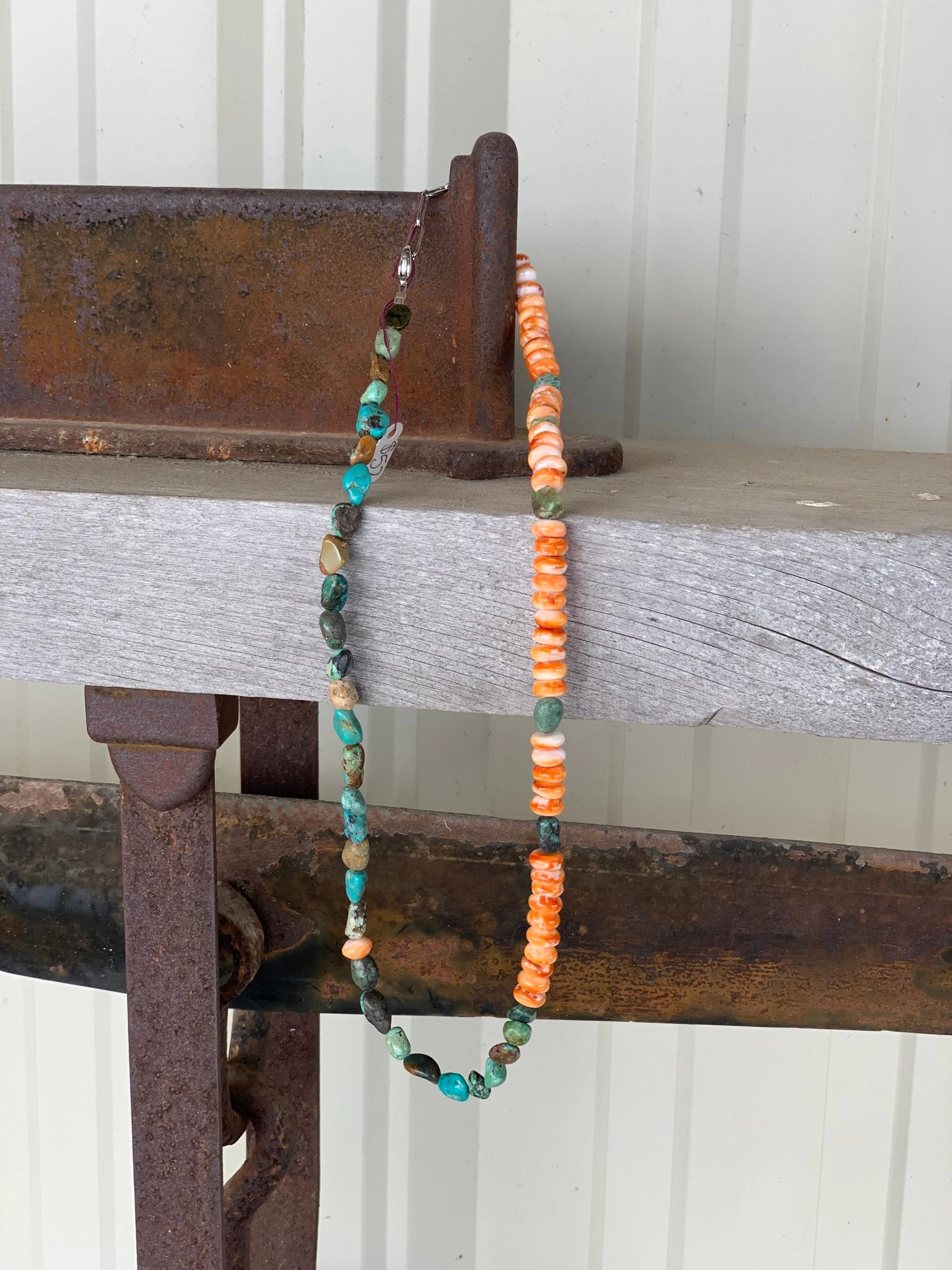 20” Orange Spiny Oyster Paired w/ Turquoise Rondells. One of a kind, hand made, hand beaded, authentic stone jewelry, Made in USA