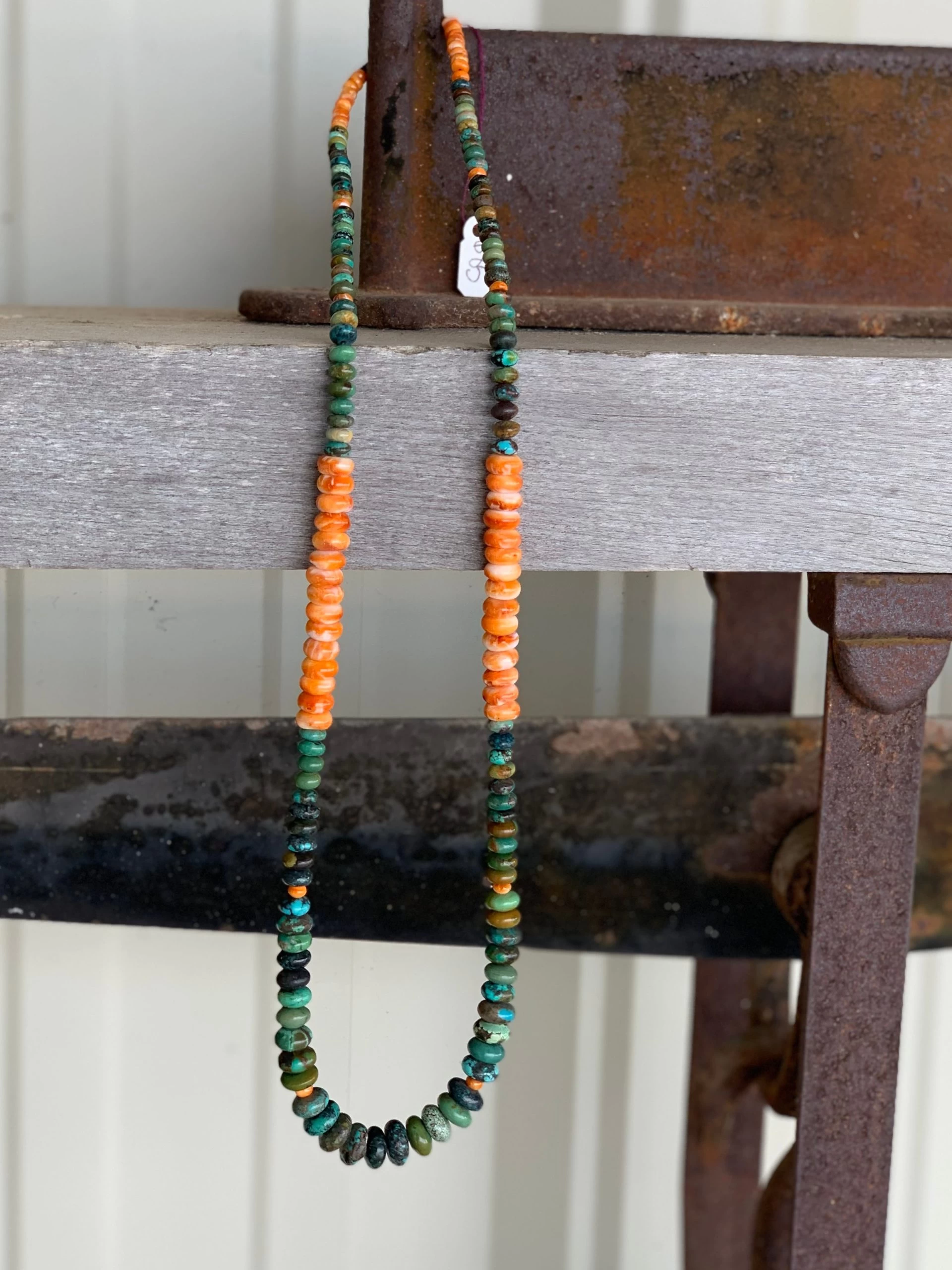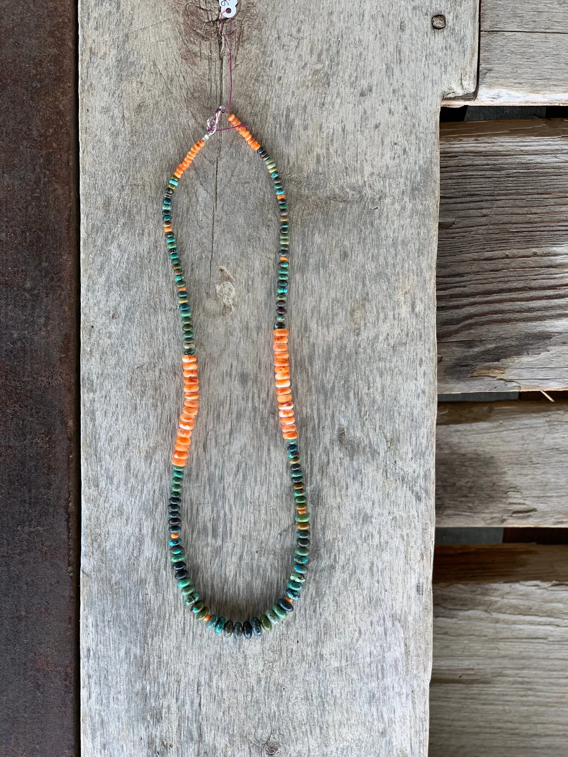 24” Necklace | Graduated Turquoise and Spiny Oyster Rondells. One of a kind, hand made, hand beaded, authentic stone jewelry, Made in USA