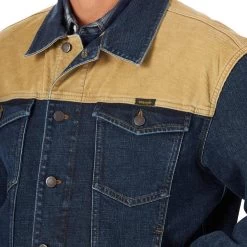 This Men’s Wrangler jean jacket is just the jacket you have been waiting for. Jacket features tan corduroy straight yoke, two side pockets, spread collar and gold stitching. A staple for every man’s wardrobe.