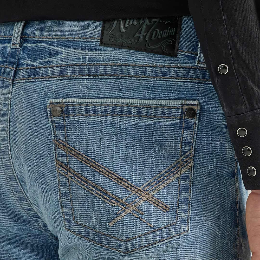 From the Rock 47 by Wrangler collection, this style features a straight leg, sits lower on the waist, has a slimmer fit through the seat, thigh and knee, and features a modern back pocket design.
