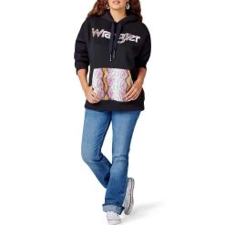 Looking to add a little bit of venom to your sssssstyle? Try the women’s Wrangler Retro snake print hoodie for a look that may look dangerous on the outside, but is soft and warm on the inside. This hoodie is made from a cotton blend with a kangaroo pocket in the front for holding your keys, or just keeping your hands warm on chillier days. Pair it with your favourite Wrangler jeans and some snakeskin boots for a striking Western-inspired look with some fangs.